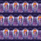 A la luz de una luna llena de Halloween, aparece un embustero naranja jack-o'-lantern que sostiene una hoja de arce de otoño, rodeado de pinos morados y calabazas de lavanda purpurinoso. Ilustracion original de la artista Noël Snow.