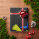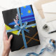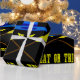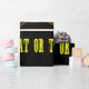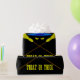 Dibujo del gorra de un mago azul, decorado con estrellas amarillas y dos escobas de brujas cruzadas bajo el gorra. Ojos amarillos demoníacos entre el gorra y las escobas y un texto Trata o truco. Divertido tema de Halloween. Come, bebe y da miedo. Productos y souvenirs horizontales o orientados al paisaje.