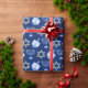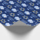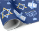 Hermoso papel de envoltura de Hanukkah en azul bonito con un fresco patrón de estrella del judaísmo, ideal para divertidos juegos de Chanukah, y la menorah judía para la festividad.