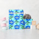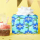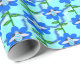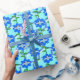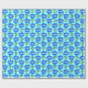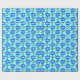 Este impresionante papel de envoltura presenta una imagen gráfica de un lindo abejorro azul con rayas azules brillantes, ojos negros, antenas azules y piernas negras. Tiene alas azul y blanco bonito. La abeja está sentada en medio de un girasol azul bonito. La flor tiene un tallo verde y tres hojas. El mensaje "Bee Day boy" aparece esparcido por las tres hojas. El fondo está compuesto por un patrón de abeja azul pálido.