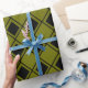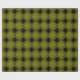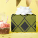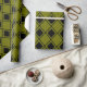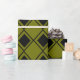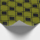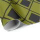 Este papel de envoltura tiene un diseño moderno de mediados de siglo de diamantes negros sólidos dentro de los contornos de diamante negro en un campo de verde.