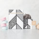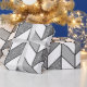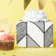 Este papel de envolvimiento presenta un elegante diseño de chevron con un patrón geométrico de arenque óseo en blanco y purpurina falso plateado con líneas negras.