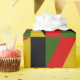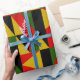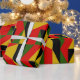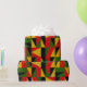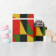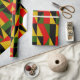 Este papel de envoltura tiene un diseño de historia negra de triángulos y rectángulos en oro, rojo, verde y negro haciendo un patrón.