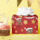 Navidades envolviendo papel con un ilustracion de un afroamericano feliz y sonriente hombre con el gorra de Santa Claus; con plantilla de texto editable; diseño de vacaciones de Navidades con un fondo rojo sin fisuras con estrellas