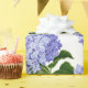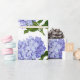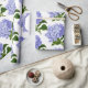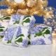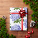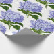 El papel de regalo está impreso con hermosas flores de hortensia azules por todas partes.