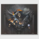 Huesos y magia, esqueleto con dados místicos. El esqueleto está envuelto en una bata encapuchada negra profunda. Su mano hueca se extiende codiciosamente por un gran dado negro que brilla en la oscuridad y exuda un aura de lo desconocido. Las llamas y el humo bailan alrededor de la figura, creando una atmósfera dramática y ominosa. ¿Está el esqueleto revelando un secreto antiguo o desatando un poder oscuro?