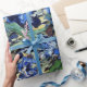Irises de Vincent van Gogh. Vintage pintura de aceite de flores de arte fino, impresionantes flores de iris azules, hojas verdes en jarrón marrón sobre fondo amarillo Navidades de vacaciones envolver papel de regalo.