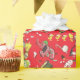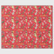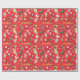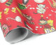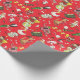 Papel de regalo navideño bonito de la época de los 50. Papel rojo brillante con todos los juguetes con los que sueñan los niños. Jack in the box, soldado de madera, muñecas, tambor, elefante de peluche y patos y por supuesto bastones de caramelo. Hay incluso gatitos y un canguro.