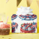 A Colorful July 4th Fruit Cake Designed In Red White And Blue Colors with An American Flag Wrapping Paper