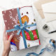 Esta imagen es de una familia de hombres de nieve, todos vestidos con sus coloridos gorras de invierno y bufandas. Una zanahoria por su nariz y botones de colores para sus ojos y boca. Se ha añadido un fondo verde y rojo con confeti de nieve. También se agregó un borde verde. Este papel de envoltura está disponible en varios estilos y tamaños.