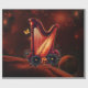 La melodía cósmica, la magia del arpa. El arpa irradia calidez y lujo, sus cuerdas doradas y su marco contrastan armoniosamente con las flores negras y naranjas que lo adornan. Estas flores son vibrantes y ricamente detalladas, dándole al instrumento una belleza natural y un toque mágico. El fondo transporta el visor a un escape espacial fascinante. Consta de nubes nórbidas profundas, azules y violetas, intercaladas con estrellas brillantes y planetas brillantes de diferentes tamaños y colores.