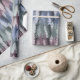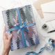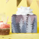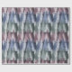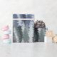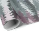 An illustration of layered pine trees arranged in horizontal bands, featuring cool pink, blue, and grey shades.