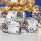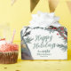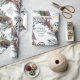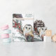 Un papel de envoltura vacacional con sus nombres y fecha en el papel con una hermosa lechuza de granero pintada de color agua en invierno descansando sobre ramas de enebro azul con bayas rojas en un patrón repetido.