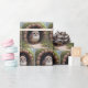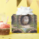 Hay dos búhos a la entrada de un acogedor arco de piedra adornado con vegetación, rodeado de flores silvestres