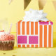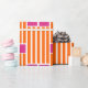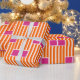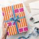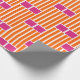 Este papel envolvente tiene un diseño moderno de mediados de siglo de líneas verticales naranjas con rectángulos rosados sobre los que se repite sobre el diseño.