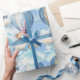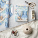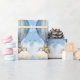Un precioso papel azul de envoltura. Bebés gemelos flotando en las nubes en globos de aire caliente. Perfecto para los regalos gemelos recién nacidos, regalos para bebés o incluso cumpleaños para los gemelos pequeños.