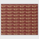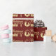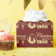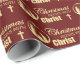 La característica de este papel de envoltura con temática de fe es una simple escena de natividad de silueta dentro de un círculo con la Estrella de Belén arriba, y el texto estilizado que dice "Los Navidades comienzan con Cristo". Al final del texto hay una cruz simple de oro. Todo es de oro brillante, sobre un fondo rojo marrón oscuro.