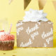 Cuidada envoltura de regalo con elegante mano elegante estilo caligrafía color blanco Gracias texto sobre un simple fondo de papel de kraft marrón falso.