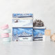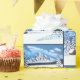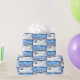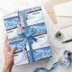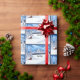 Papel de regalo con una hermosa escena invernal, que incluye montañas cubiertas de nieve, cabaña y pinos. El fondo, las imágenes y el texto se pueden personalizar. Obra original de W.B.