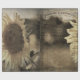 Cierre la foto de un girasol con un proceso digital envejecido y un superpuesto de la página de inventario de un almacén de fincas, más una abeja en la esquina inferior derecha. Y otra abeja con girasol en foto.