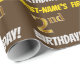 Este diseño de papel envolvente incluye un mensaje como "¡Segundo cumpleaños de NOMBRE PRIMERO!", con el "segundo" con un aspecto de color falso/imitación de color dorado, y con el nombre y el "CUMPLEAÑOS" en un tipo de letra divertido y audaz. El nombre se puede personalizar y el fondo es marrón. El envolvimiento de papel como este podría ser usado cuando se le dan regalos de cumpleaños a alguien en celebración de su segundo cumpleaños. [~Z0000211]