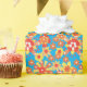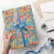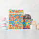 Un rollo de papel envuelto muy elegante, con un patrón de flores rojas, naranjas y amarillas sobre un fondo turquesa brillante, de un collage de papel pintado a mano de Judy Adamson.
