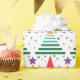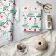 Papel de envoltorio para regalos del navidad con un modelo moderno de los árboles de navidad. El modelo de la MOD con el ilustracion verde de los árboles de navidad, púrpura protagoniza y la nieve gris añade un tacto festivo a sus regalos del navidad.