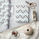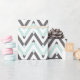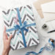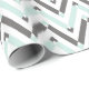 Papel de envolvimiento moderno con un patrón de chevron geométrico azul menta, blanco y gris.