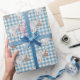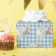elefante gris suave con un mono colgando de su maletero con un patrón de gingham azul y crema.