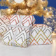 Este papel de envoltura tiene un diseño art deco de Vs de cabeza en colores retro de naranja, verde azulado, dorado, negro, rojo, marrón y gris.