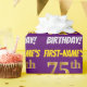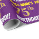 Este diseño de papel de regalo presenta un mensaje como "¡LOS 75 AÑOS DE CUMPLEAÑOS DE NOMBRE!", con el "75" teniendo una apariencia de color dorado falso/imitación, y con el nombre y "CUMPLEAÑOS" en una fuente divertida y negrita. El nombre se puede personalizar, y el fondo es de color púrpura. El papel de regalo como este podría ser utilizado quizás al envolver regalos de cumpleaños que se dan a alguien en celebración de sus setenta y cinco años.