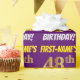 Este diseño de papel envolvente incluye un mensaje como "¡CUMPLEAÑOS 48 DE PRIMER NOMBRE!", en el que el "48" tiene un aspecto de color falso/imitación de color dorado, y con el nombre y el "CUMPLEAÑOS" en un tipo de letra divertido y audaz. El nombre se puede personalizar y el fondo es morado. El envolvimiento de papel como este podría ser usado cuando se le dan regalos de cumpleaños a alguien en celebración de sus cuarenta y ocho años. [~Z0000206]