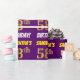 Este diseño de papel envolvente incluye un mensaje como "¡58º CUMPLEAÑOS DE SAMANTHA!", en el que el "58º" tiene un aspecto de color falso/imitación dorado, y con el nombre y el "CUMPLEAÑOS" en un tipo de letra divertido y audaz. El nombre se puede personalizar y el fondo es morado. El papel envuelto como este podría ser usado cuando se le dan regalos de cumpleaños a alguien en celebración de sus cincuenta y ocho años. [~Z0000206]