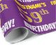 Este diseño de papel envolvente incluye un mensaje como "¡59º CUMPLEAÑOS!", con el "59º" con un aspecto de color falso/imitación dorado, y con el nombre y el "CUMPLEAÑOS" en un tipo de letra divertido y audaz. El nombre es personalizable y el fondo es morado. El papel envuelto como este podría ser usado cuando se le dan regalos de cumpleaños a alguien en celebración de sus cincuenta y nueve años. [~Z0000206]