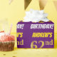Este diseño de papel envolvente incluye un mensaje como "¡EL CUMPLEAÑOS 62 DE ANDREW!", con el "62" con un aspecto de color falso/imitación de color dorado, y con el nombre y el "CUMPLEAÑOS" en un tipo de letra divertido y audaz. El nombre se puede personalizar y el fondo es morado. El papel envuelto como este podría ser usado cuando se le dan regalos de cumpleaños a alguien en celebración de su sexagésimo segundo cumpleaños. [~Z0000206]