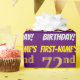 Este diseño de papel envolvente incluye un mensaje como "¡CUMPLEAÑOS 72 DE PRIMER NOMBRE!", mientras que el "72" tiene un aspecto de color falso/imitación de color dorado, y con el nombre y el "CUMPLEAÑOS" en un tipo de letra divertido y audaz. El nombre es personalizable y el fondo es morado. El envolvimiento de papel como este podría ser usado tal vez cuando se le dan regalos de cumpleaños a alguien en celebración de su cumpleaños setenta y dos. [~Z0000206]
