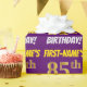 Este diseño de papel envolvente incluye un mensaje como "¡CUMPLEAÑOS 85 DE PRIMER NOMBRE!", en el que el "85" tiene un aspecto de color falso/imitación de color dorado, y con el nombre y el "CUMPLEAÑOS" en un tipo de letra divertido y audaz. El nombre se puede personalizar y el fondo es morado. El envolvimiento de papel como este podría ser usado cuando se le dan regalos de cumpleaños a alguien en celebración de sus ochenta y cinco años. [~Z0000206]
