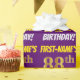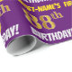 Este diseño de papel envolvente incluye un mensaje como "¡CUMPLEAÑOS 88 DE PRIMER NOMBRE!", en el que el "88" tiene un aspecto de color falso/imitación de color dorado, y con el nombre y el "CUMPLEAÑOS" en un tipo de letra divertido y audaz. El nombre se puede personalizar y el fondo es morado. El envolvimiento de papel como este podría ser usado cuando se le dan regalos de cumpleaños a alguien en celebración de sus ochenta y ocho años. [~Z0000206]