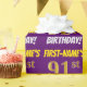 Este diseño de papel envolvente incluye un mensaje como "¡CUMPLEAÑOS 91 DE PRIMER NOMBRE!", mientras que el "91" tiene un aspecto de color falso/imitación de color dorado, y con el nombre y el "CUMPLEAÑOS" en un tipo de letra divertido y audaz. El nombre es personalizable y el fondo es morado. El envolvimiento de papel como este podría ser usado cuando se le dan regalos de cumpleaños a alguien en celebración de su cumpleaños noventa. [~Z0000206]