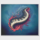 Music in motion, the curved piano. The keyboard consists of classic white and black keys, clearly separated from each other and set against a dark frame. This frame creates an elegant contrast and highlights the keys. A dynamic, artistic element unfolds around the keyboard: flowing shapes in vibrant red, purple, and gray tones seem to creep out from the keyboard or surround it. These shapes are curved and organically designed.