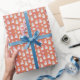 Hombres de nieve con gorras y pañuelos de color verde, rojo, amarillo y morado sobre un fondo naranja.