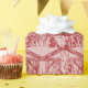 Un diseño estampado rojo, con María, José y el Niño Jesús en el hombro bajo una estrella brillante contra un fondo rojo texturado.