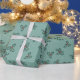 Papel de regalo con fondo turquesa y detalles de copos de nieve y ramas de acebo.