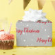 Texto de navidad de mora roja sobre copos de nieve blancos y fondo gris suave.