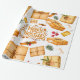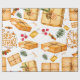 Este papel de regalo con aspecto vintage, presenta regalos envueltos en papel marrón junto con ramas de canela, pino y bayas, cintas y etiquetas de regalo.