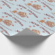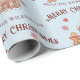 Este personalizado Navidad festivo o papel de envoltura de vacaciones presenta un sano tema de pan de jengibre en un suave fondo azul para bebés. Una imagen de una casa de pan de jengibre está retratada en el centro, con un lindo hombre de pan de jengibre a la izquierda. Pequeñas galletas rojas de copos de nieve están nevando desde el cielo. Se imprime una muestra de saludo de Feliz Navidad encima del árbol y debajo se imprime un ejemplo de nombre de familia. Puede personalizar el ajuste para incluir su propio nombre o texto personalizado.