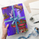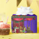Un colorido papel envuelto de Navidades con un carrusel vintage y caballos de carrusel para añadir un toque retro y un ambiente de carnaval a los regalos y envolturas de regalo de tus Navidades esta temporada de vacaciones. El diseño presenta un patrón de carrusel en verde y rosa con caballos de madera de colores, rodeados por caballos pintados de marrón y blanco que se pasean a su alrededor, con rastros de estrellas Navidades rosas sobre el fondo azul degradado
