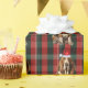 Un adorable ilustracion acuático de un manto de Basset, parejas con un fondo rojo y verde de temporada con estampado y el perro lleva un gorra rojo festivo.