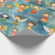 Papel de envoltura festivo con un patrón de ángeles lindos sobre un fondo azul.