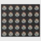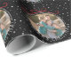 Este papel de envolver de regalo para Navidades presenta un gráfico de un adorno de árbol redondo con un marco de foto personalizado. Las palabras "Feliz Navidad" rodean el exterior del marco de la foto. El fondo es negro con puntos blancos que representan copos de nieve. Fotografía © Storytree Studios, Stanford, CA